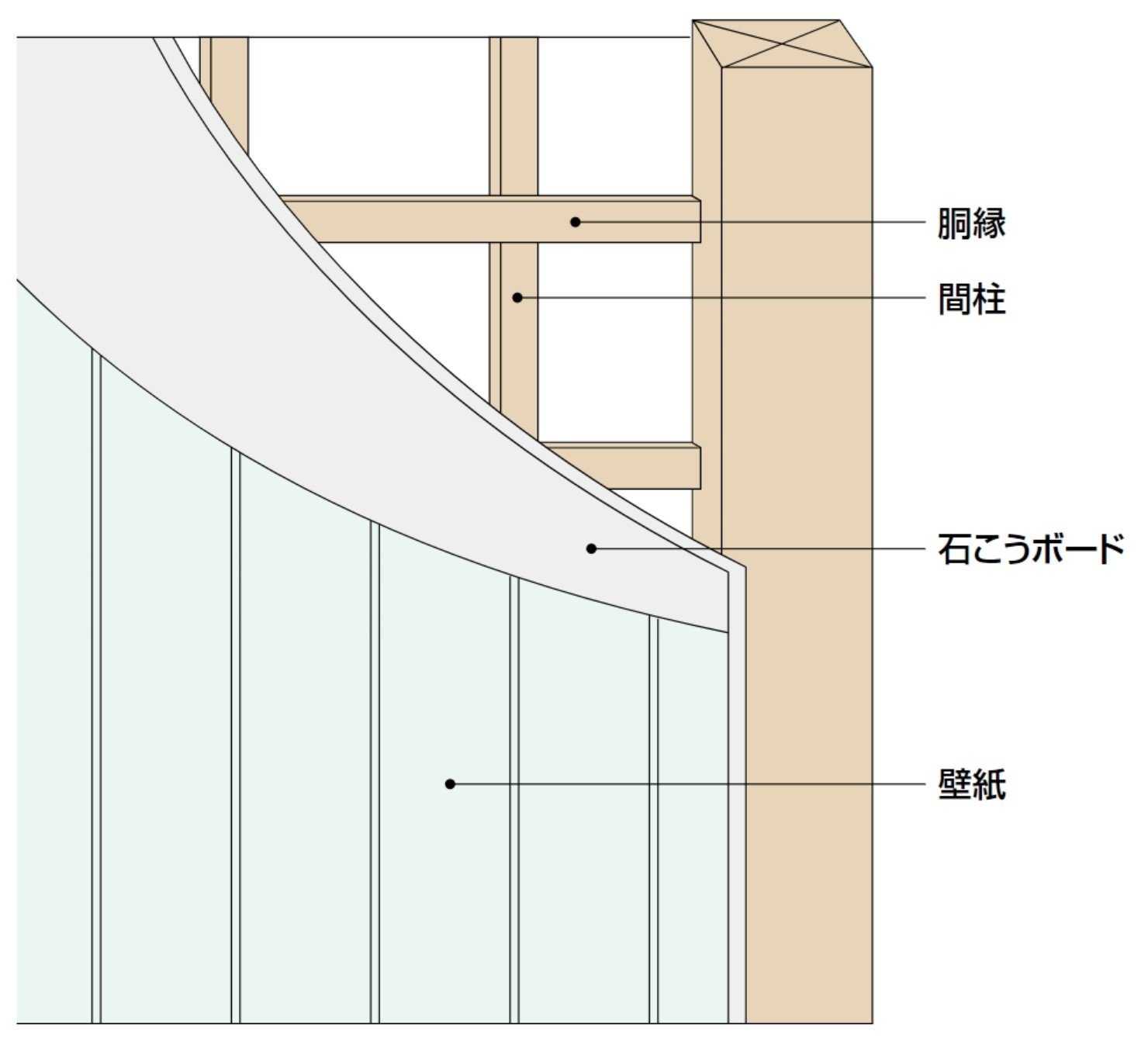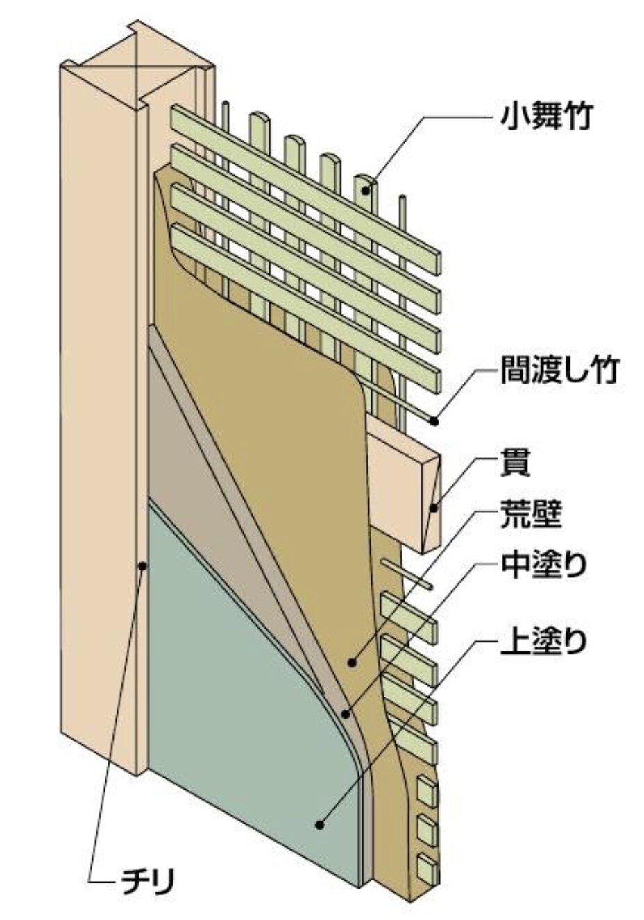 和室に多い壁です。柱が露出していて、柱と柱の間に土壁やジュラクや漆喰など和風の壁が塗りこめられています。