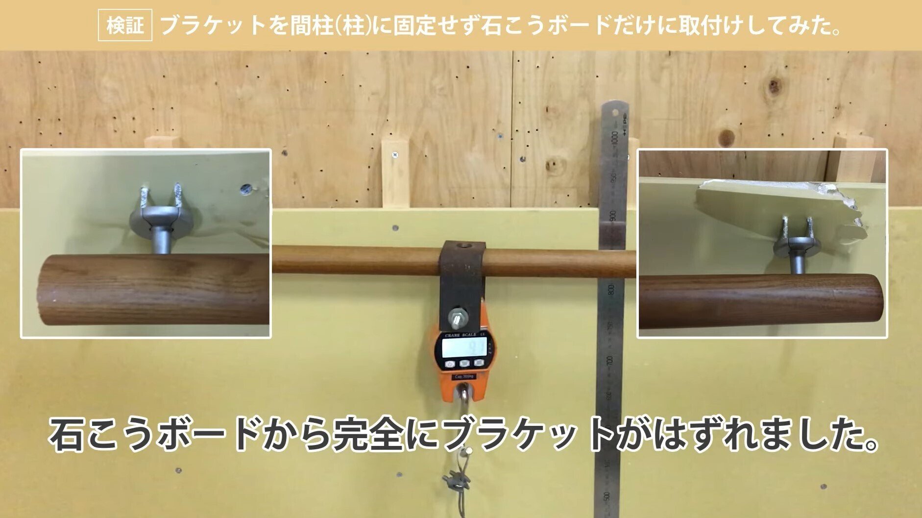 ちなみに同様の試験を、石こうボード12.5mm厚+木下地20mm以上のところへ固定した手すりで行うと、120kgfの荷重をかけても異常は見られませんでした。強い子よい子。