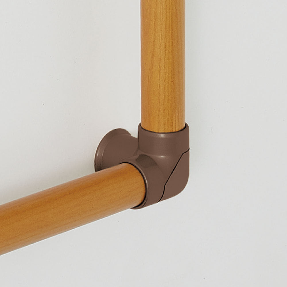 廊下の曲がり角、階段の踊り場、玄関周辺など、手すり棒を直角(90°)に曲げる部分に使用します。途切れることのない連続した手すりを実現でき、安全性が大幅に向上します。手すりを掴んだまま方向転換できるため、高齢者の方や車椅子をご使用の方も安心して移動できます。