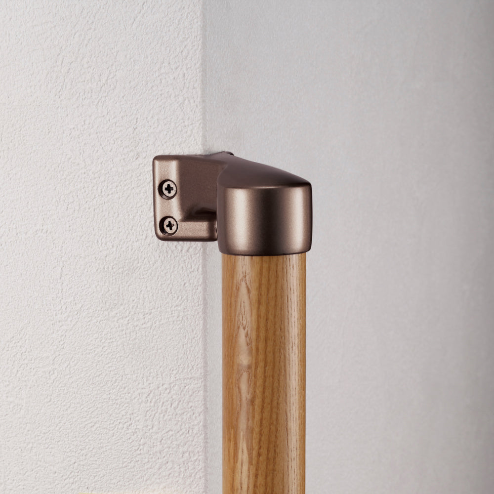マツ六のECLEシステム手すり35シリーズ出隅ブラケットは、壁や柱の角(出隅)に縦型手すりを取り付けることができる専用ブラケットです。玄関の上がり框、階段の踊り場、廊下の柱周辺など、立ち上がりや方向転換をサポートする縦型手すりの設置に最適。横型としても使用でき、同シリーズのECLE製品と組み合わせて自由な手すりシステムを構築できます。